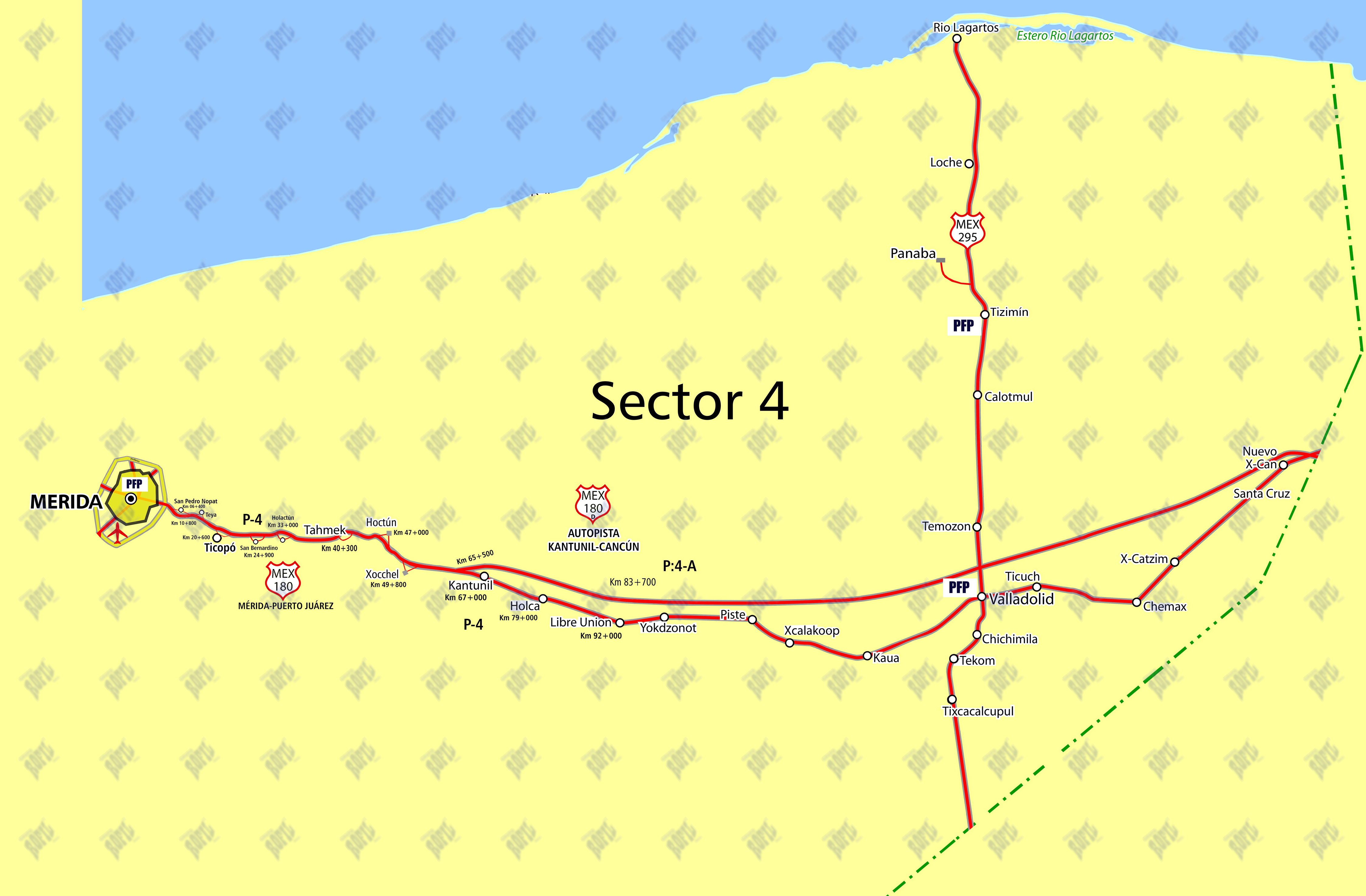 CARR. 180 Merida-Pto Juarez Lim. de Edo. de Q Roo CARR. 295 Valladolid-Rio lagartos RAMAL Kikil-Panaba Valladolid-Carrillo Pto. TRAMO Valladolid-Lim. de Edo. Q Roo CARR. 180-D Autopista Kantunil-Cancun Lim. de Edo. de Q Roo |
